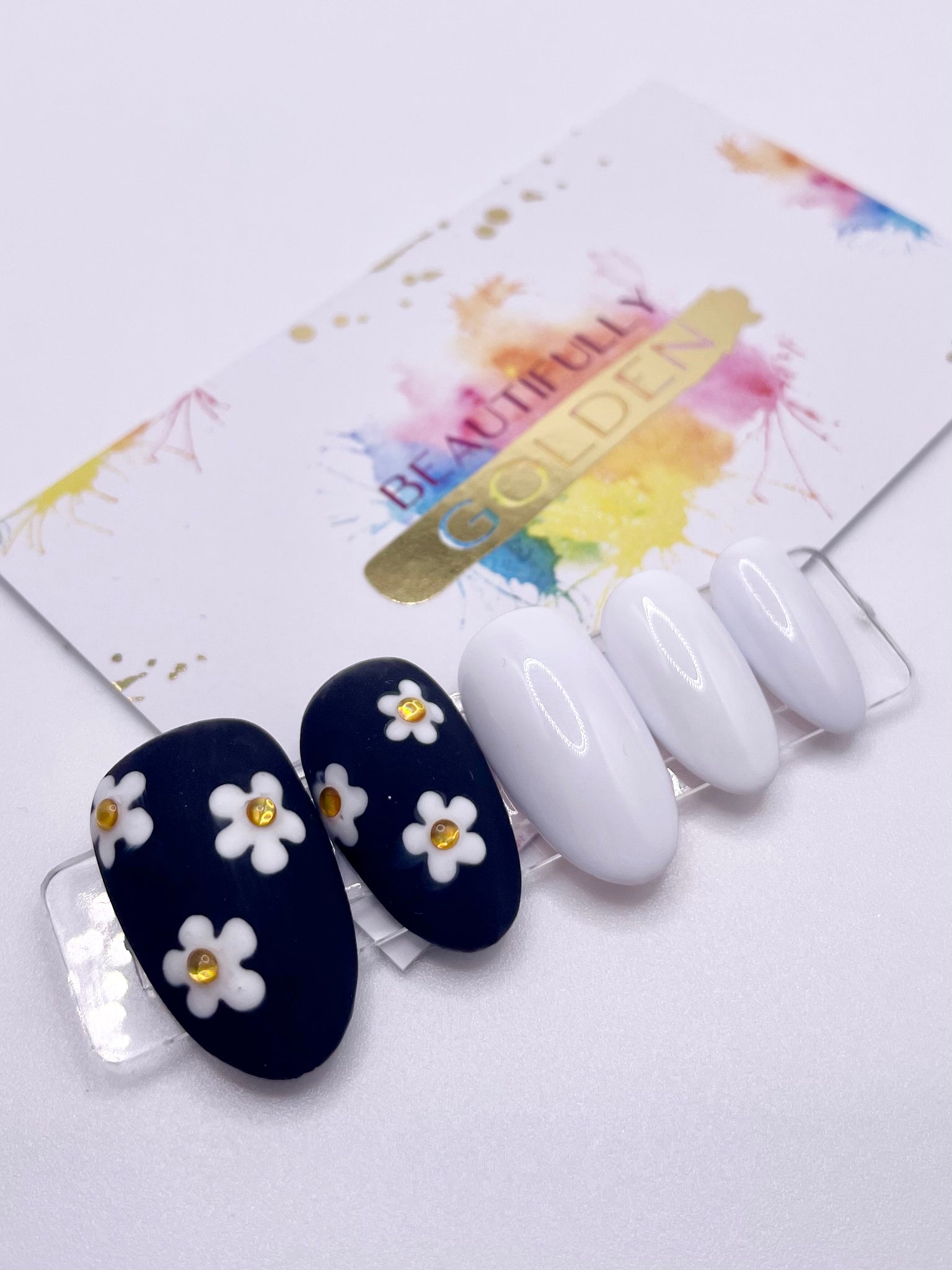 Our black and white daisy nail is featured in a short rounded style, which provides little to moderate additional length to the natural nail