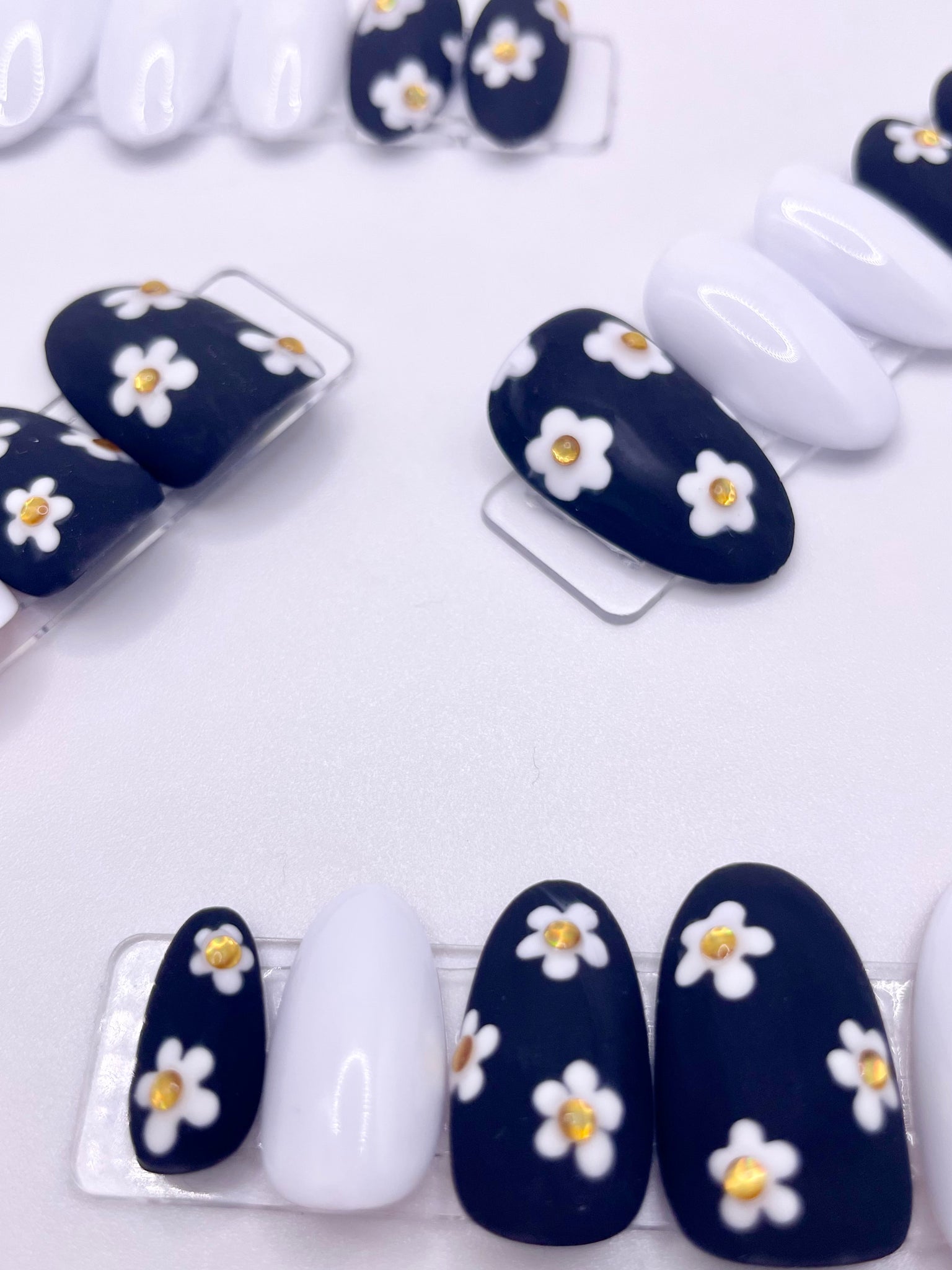 Pop into spring with these beautiful hand painted daisy press on nails. These one-size-fits-most press ons are an easy and fun way to spice up your look, with their chic and cheerful design. Who knew black and white could be so vibrant? Show your style with these fab flowers!