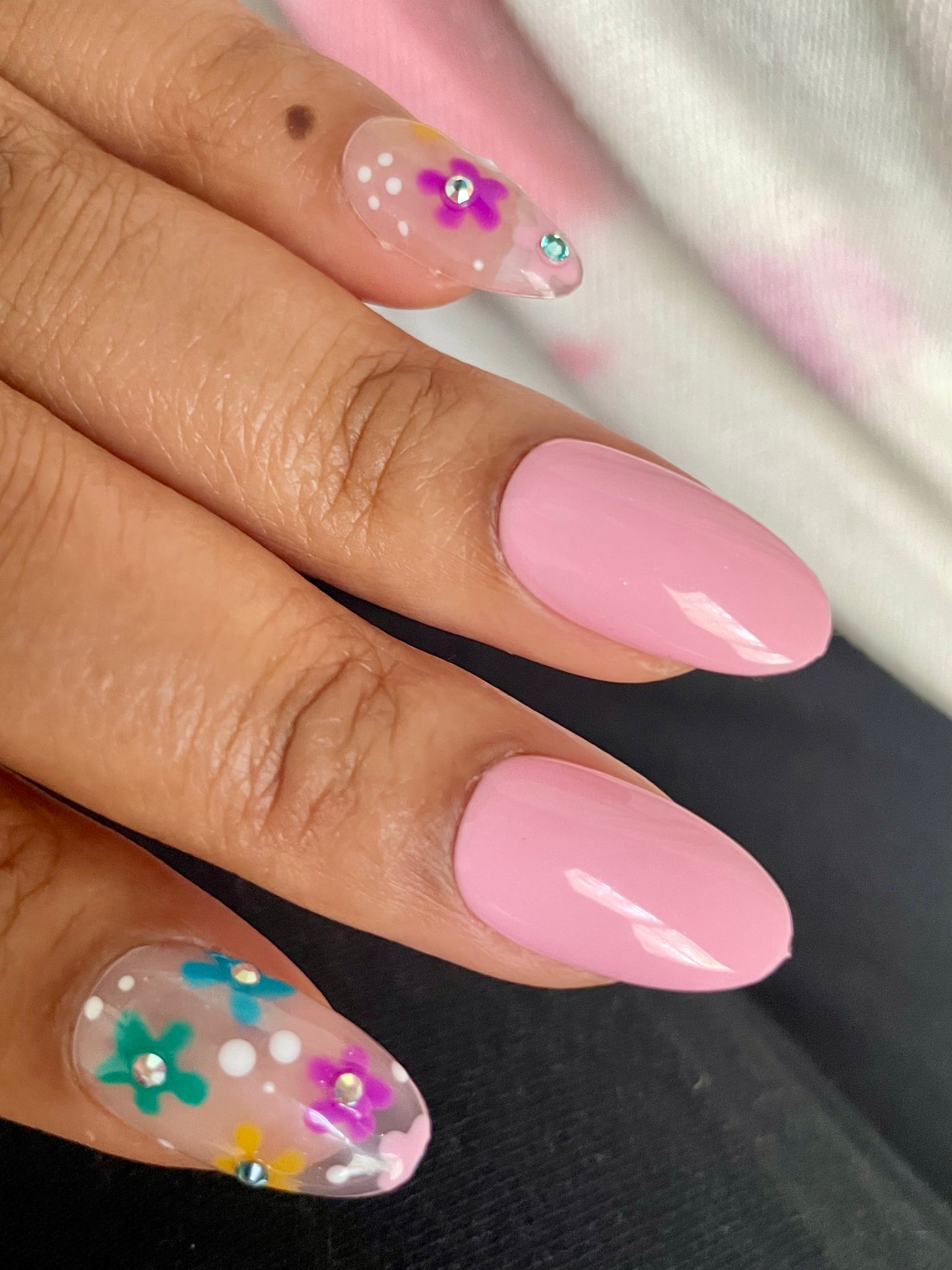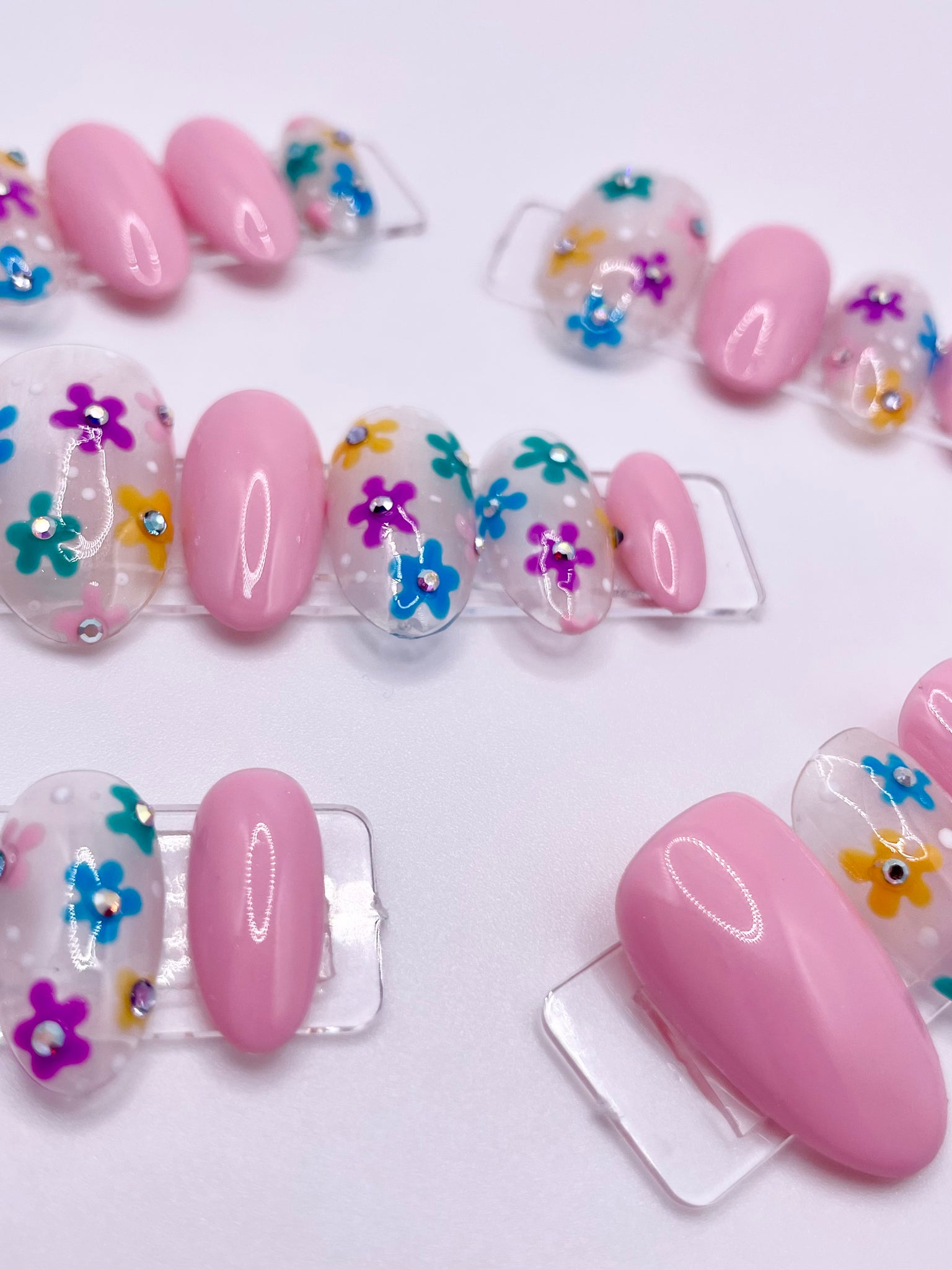 Our color pop daisy nail is featured in a short rounded style, which provides little to moderate additional length to the natural nail
